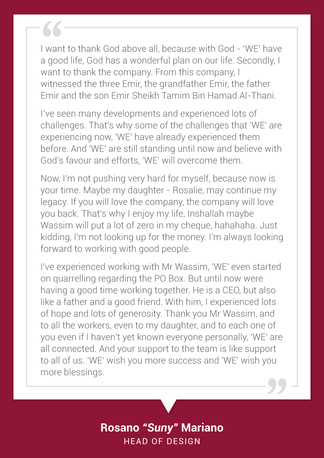 Through the years, Suny's talents and efforts have helped our success. Together, 'WE' take pride in his accomplishments and commitment to excellence.